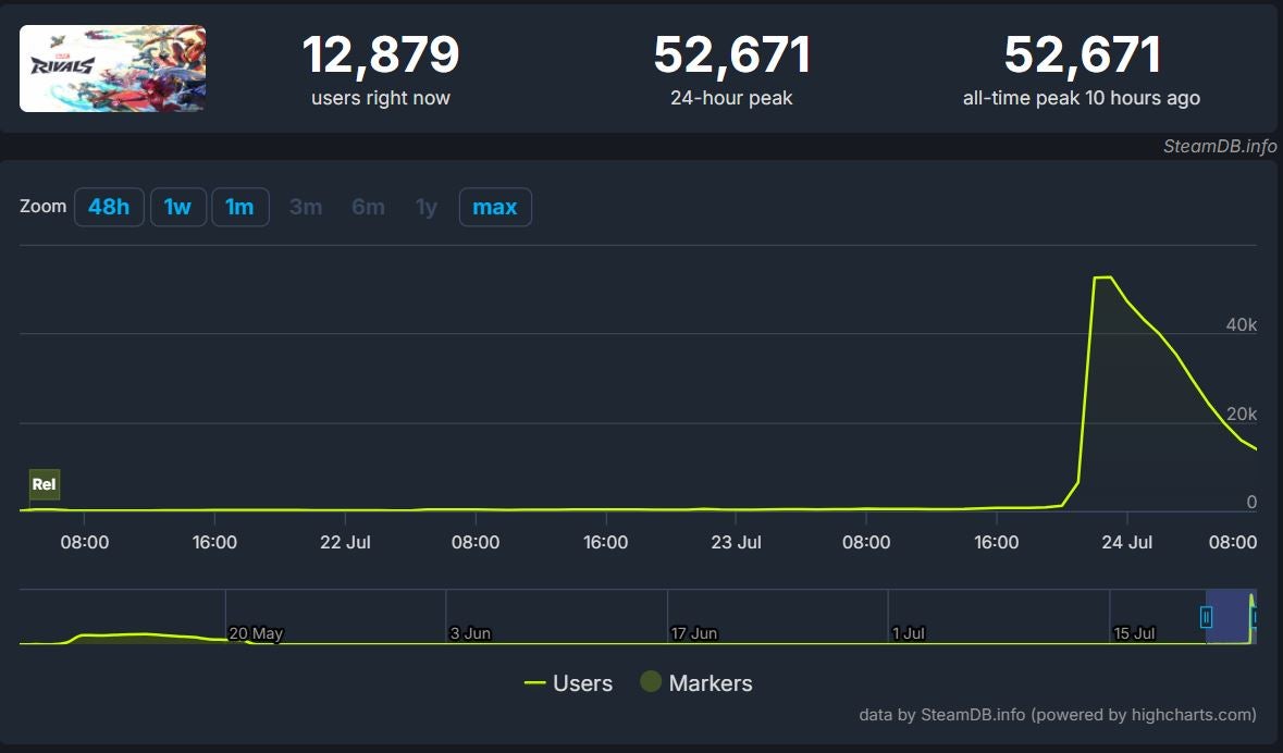De acordo com dados do SteamDB, a beta conseguiu reunir 52,671 jogadores em simultâneo, com 12,879 utilizadores a jogarem Marvel Rivals neste momento. Este é um valor bastante interessante para uma beta fechada e, caso estes valores sejam semelhantes noutras plataformas, é possível que a Marvel tenha um grande sucesso em mão.