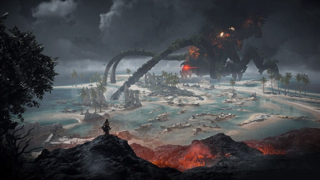 Estamos falando da épica batalha contra o Hórus, o Diabo Metálico encontrado nos litorais ardentes. Seu design não ficou tão assustador e gigante por acaso, não. A intenção da Guerrilla era realmente “contar a história do fim do mundo no universo da franquia Horizon”, conforme relatado em artigo no PS Blog.