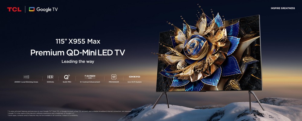 Começando pela maior de todas, temos a TCL X955 MAX 115’’, a maior TV QD-Mini LED do mundo com 115 polegadas, taxa de atualização de 144Hz, 20 mil zonas de iluminação independentes, suporte para Dolby Vision QI, IMAX Enhanced, HDR10+ Adaptativo, brilho de 5.000 nits e resolução 4K.