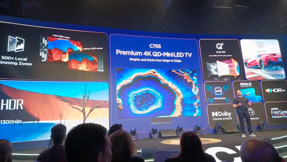 Disponível nos tamanhos de 65, 75 e 85 polegadas, a TCL C755 traz um painel QD-Mini LED 4K com 144Hz, suporte para tecnologias HDR 10+, Dolby Vision IQ, IMAX Enhanced, Local Dimming, MEMC 120 Hz, taxa de atualização variável (VRR), FreeSync Premim Pro e Dolby Vision Gaming.